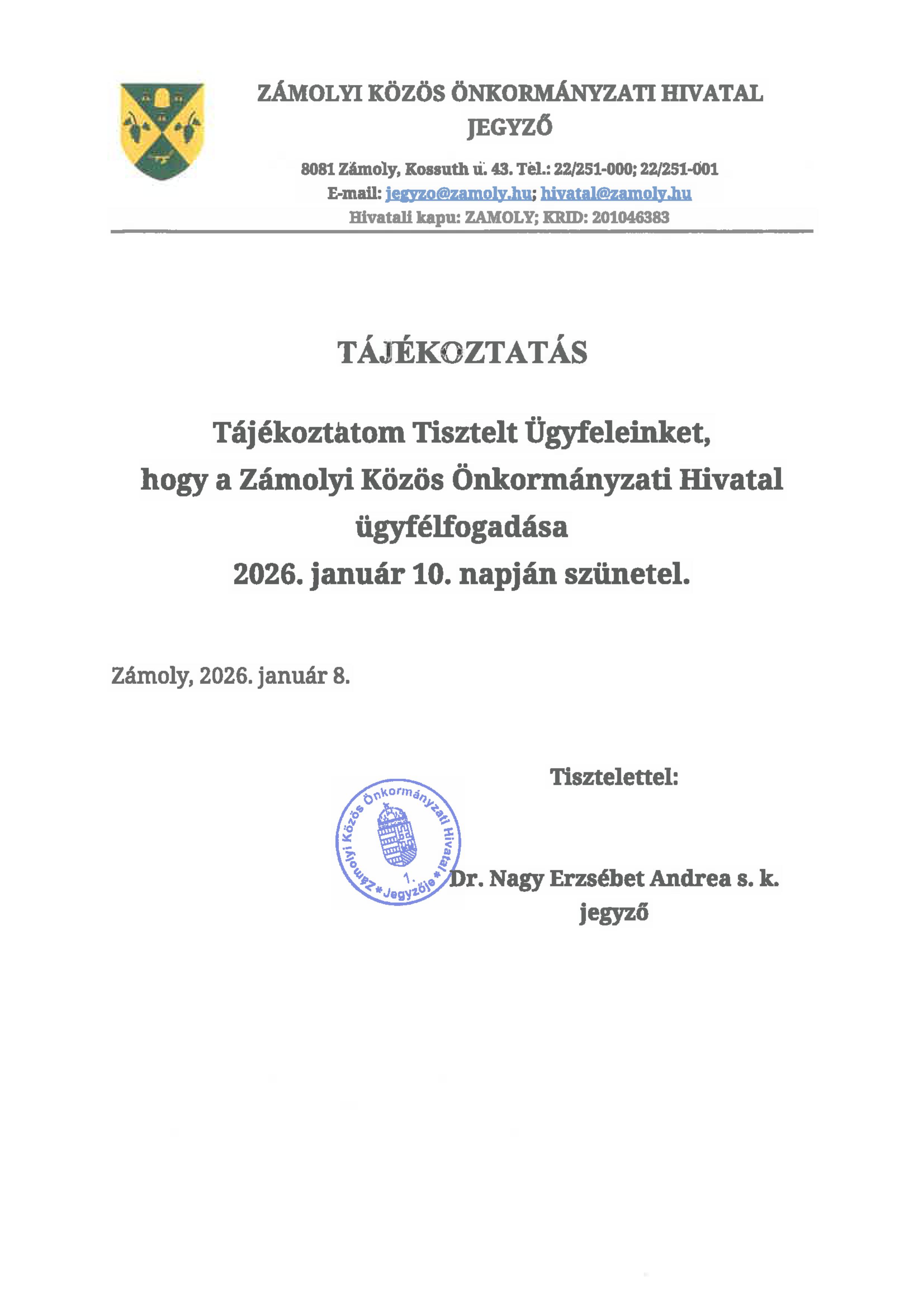 Tájékoztatom az Ingatlantulajdonosokat, hogy Zámoly Község Önkormányzata Képviselő-testülete a 2025. december 3. napján megtartott rendes nyílt ülésén megalkotta a zártkerti ingatlanok művelés alóli kivonásáról szóló 20/2025. (XII. 4.) önkormányzati rendeletét. Az önkormányzati rendelet 2025.